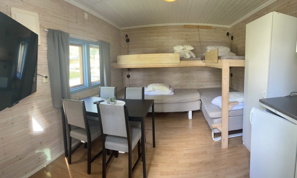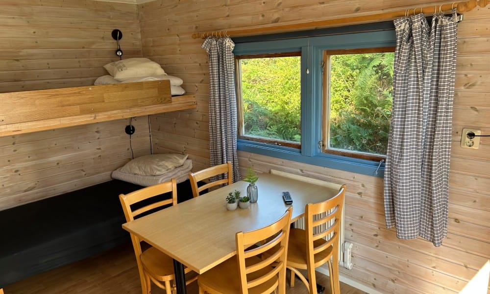 • Samtliga stugor har täcken, kuddar, kylskåp, kaffebryggare, vattenkokare. Porslin finns till samtliga boende i stugan